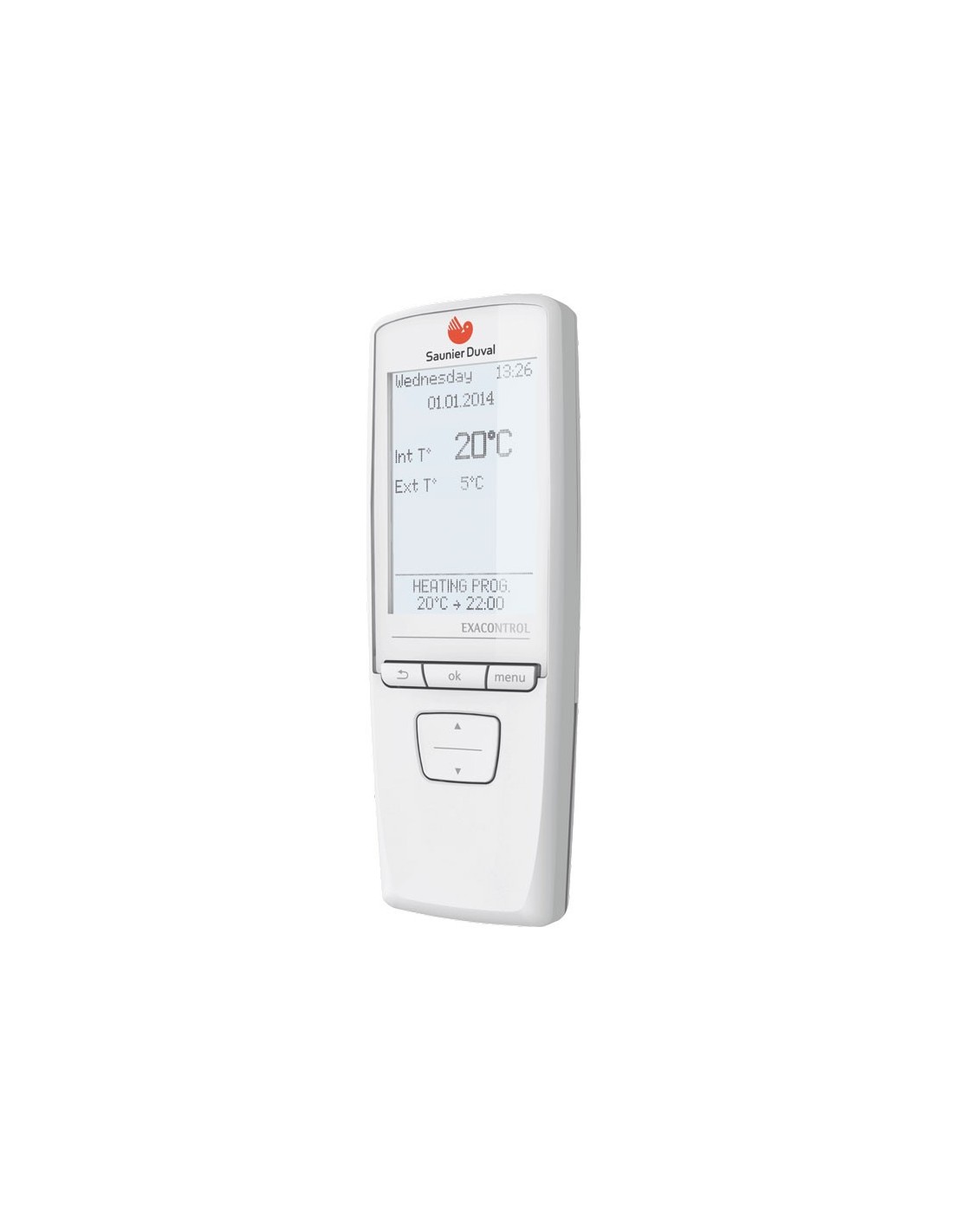 El mando a distancia Se ha diseñado para ser utilizado con facilidad y poder acceder a todas las prestaciones sin cables, sin obras y adaptándose a cualquier tipo de instalación ya existente. Su gran pantalla se puede programar para ser vista en diferentes idiomas y cuenta con retroiluminación para hacer más sencilla la lectura. Cuenta con un total de 5 botones " una tecla-una función", con control modulante. El termostato ambiente manda la señal de demanda de calefaccióna la caldera en función de la temperatura ambiente.