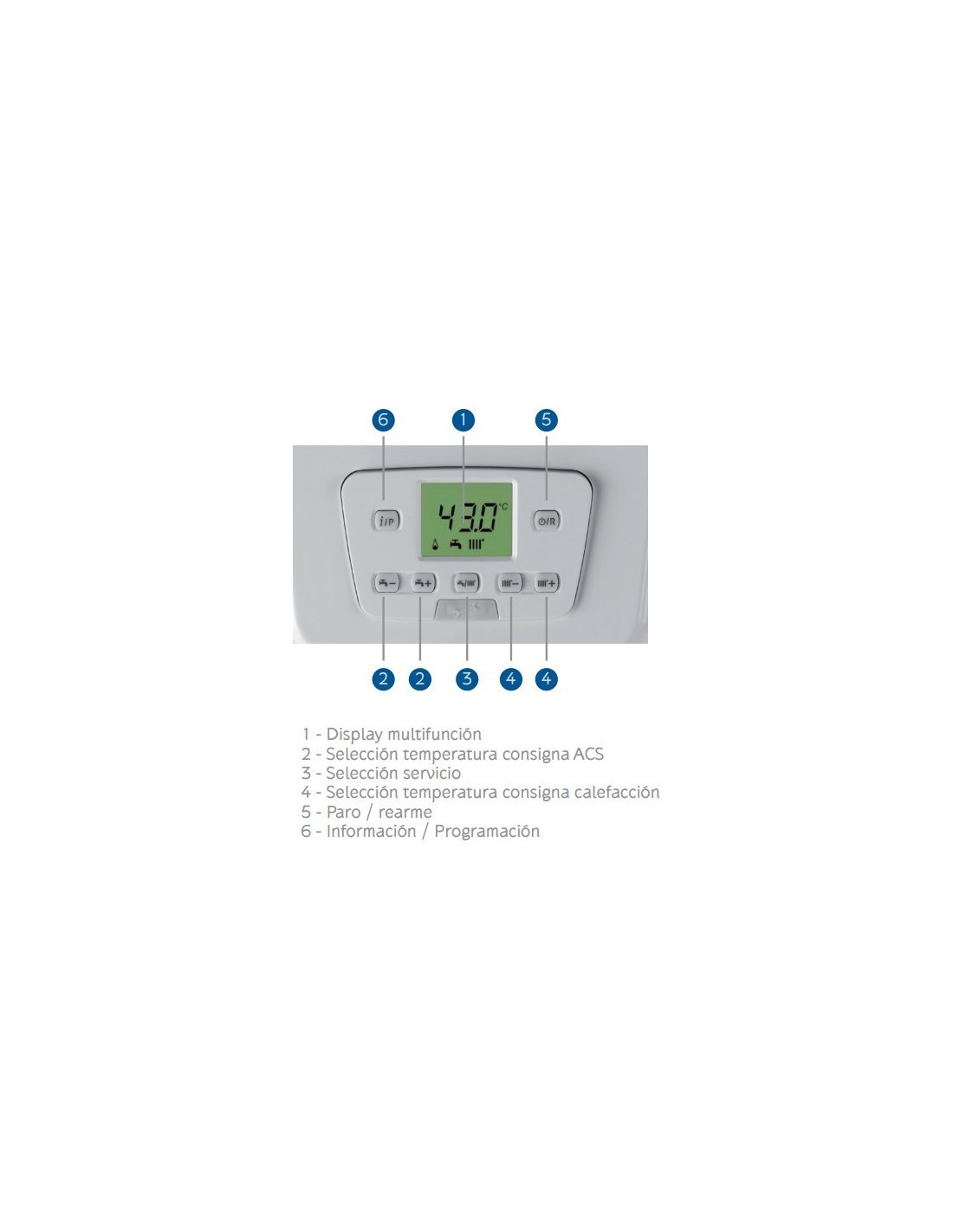 Posee pantalla retroiluminada que proporciona una amplia información acerca del funcionamiento de la caldera o la regulación de la temperatura del agua caliente sanitaria. En el cuadro se pueden ver todas sus funciones especificadas.