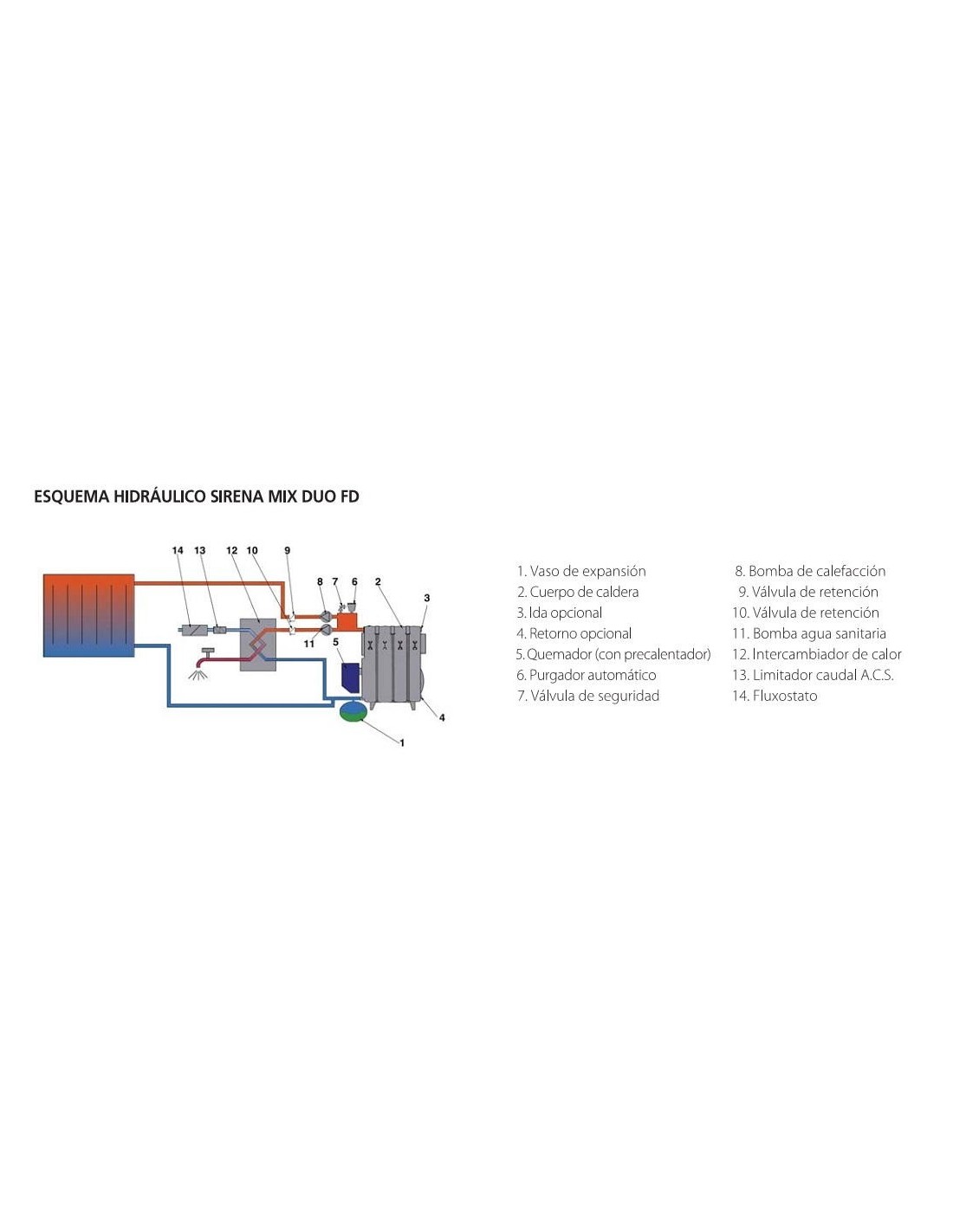 La Caldera SIRENA Mix Duo HFD 40 tienen una potencia de 39,4 kW cuerpo de combustión en hierro fundido, y cuenta con un elevado nivel de rendimiento de combustión, con niveles que superan el 93% del PCI.